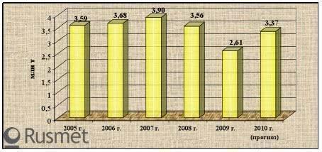 Производство нержавеющей стали в Японии за 2005-2009 гг. и прогноз на 2010 г., млн т