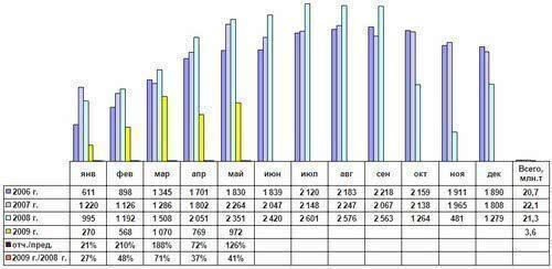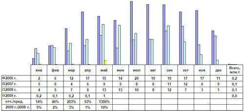 Наиболее драматично (-73%) по итогам 5 месяцев 2009 г. сократился экспорт лома, что не позволяет поддерживать ломозаготовительную отрасль в условиях сократившегося внутреннего потребления. Сокращение импорта до уровня всего 5% от прошлогоднего не критично, поскольку импортный лом традиционно составляет менее 1% общего его потребления в РФ, не оказывая никакого влияния на рынок.