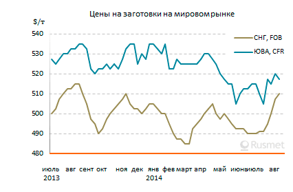 Если в конце июля компании из СНГ предлагали полуфабрикаты по $495-500 за т FOB, то к началу второй декады августа котировки дошли до $510 за т FOB, а некоторые компании уже выставляют предложения из расчета $515-520 за т FOB с поставкой в сентябре. Пока большинство потребителей считают такое повышение избыточным, но в целом вероятность продолжения роста достаточно велика.
