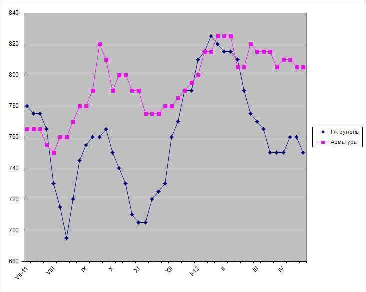 Все это, как говорится, прекрасно, однако котировки на стальную продукцию на американском рынке после незначительного повышения в первой половине апреля снова пошли вниз. Средний уровень цен на горячекатаные рулоны вопреки усилиям местных производителей так и не дошел до отметки $700 за короткую т ($772 за метрическую т). В конце месяца сделки на спотовом рынке осуществлялись на уровне $740-765 за метрическую т EXW по сравнению с $750-770 за т в середине апреля. Кроме того, из-за понижения котировок на металлолом немного подешевела арматура, которая сейчас предлагается местными компаниями примерно по $800-810 за т EXW.
