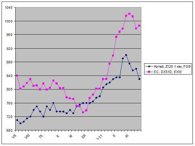 Радикальное понижение цен позволило китайским компаниям получить новые заказы, преимущественно, из стран Латинской Америки, но в целом спрос низкий. Правительство Китая, опасаясь перегрева экономики, принимает меры по дальнейшему ограничению притока средств в реальный сектор, заставляя банки увеличивать процентные ставки и повышая нормативы резервирования. Это оказывает резко негативное влияние на национальную строительную отрасль. Американские покупатели в феврале существенно пополнили запасы продукции, а теперь не рискуют заключать новые контракты с поставкой в июле-августе, хотя нынешние котировки на китайскую оцинковку более чем на $300 за т ниже тех цен, что предлагают американские компании.