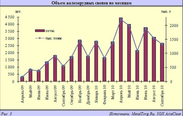 В июне спад продолжился – SGX провела клиринг 2183 лотов, что эквивалентно приблизительно 1,1 млн т железной руды стоимостью около $150 млн. В июле последовал пик, далее, в августе-сентябре, – спад, невзирая на рост выпуска стали и импорта руды в КНР. Растущее потребление было замечено «торговцами» только в октябре: объем сделок вернулся на уровень августа текущего года (рис. 3).