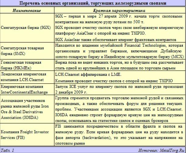 Клиринг свопов (безналичные расчеты между банками, очистка от пошлин) биржи проводят с опорой именно на индекс спотовых цен руды. А сделки по железорудным свопам уже осуществляются на весьма многих площадках (табл. 1).
