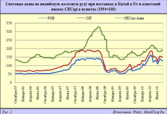 Причем, подтверждая китайскую позицию, спотовые цены на железную руду давно и неплохо действительно коррелируют именно со стальными ценами (рис. 2).