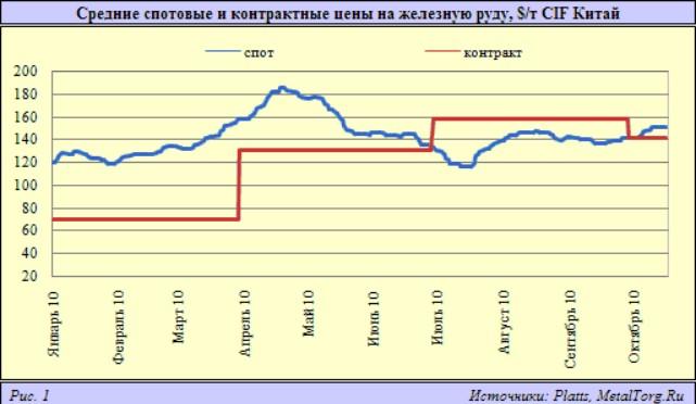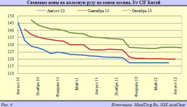 К примеру, в результате наметившейся тенденции роста спотовых цен в последние месяцы на рынке своповых контрактов также произошло повышение стоимости руды. Так, если еще в конце августа 2010 г. цены на железорудные свопы для октября текущего года составляли $128,83 за т (-$0,67 к концу июля), то в последний день сентября они поднялись до $137,17 за т (+$8,4), а 20 октября своп-цена составила $147,17 за т (+$10).