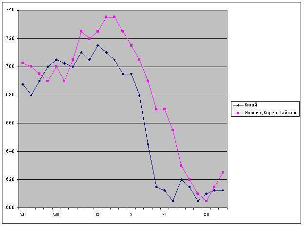 В авангарде этого процесса выступают японские компании, которые в течение 2011 года понесли наибольшие потери в конкурентной борьбе. Из-за высокого курса иены и, наоборот, низкого корейской воны по отношению к доллару предложения корейских компаний оказались более привлекательными. В январе-ноябре экспорт горячего проката из Кореи лишь немного не достиг отметки в 5,0 млн. т, увеличившись на 40% по сравнению с аналогичным периодом прошлого года. В то же время, японские поставки сократились. Причем, японским металлургам пришлось увеличить объем продаж на рынки Северной и Центральной Америки, а также Ближнего Востока. В ноябре и начале декабря эти поставки часто осуществлялись по ценам порядка $560-580 за т FOB.