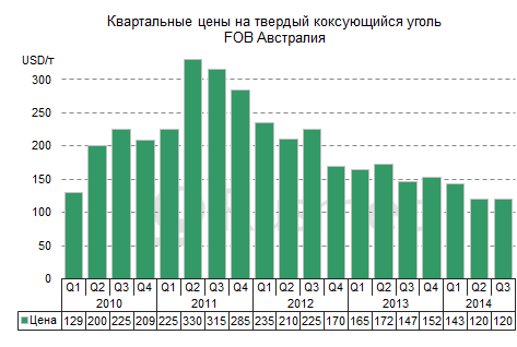 /Rusmet.ru, Виктор Тарнавский/ Мировые цены на коксующийся уголь практически непрерывно снижаются на протяжении более трех лет. С тех пор, как этот материал достиг пика во втором квартале 2011 года на уровне $330 за т FOB Австралия, котировки идут под уклон. В первой половине сентября 2014 года «твердый» австралийский коксующийся уголь продавался несколько дешевле $110 за т FOB Австралия или $122-124 за т CFR Китай, потеряв в цене около $10 за т с начала третьего квартала.
