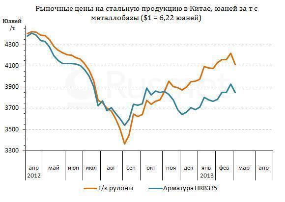 Впрочем, скорее всего, в марте китайские металлурги повторят попытку повышения котировок. Нынешние цены их ни в коей мере не устраивают. По данным CISA, 70 крупнейших производителей стали в стране завершили прошлый год с совокупной прибылью в размере всего лишь 1,58 млрд. юаней (около $250 млн.). Это на 98,2% (!) меньше, чем в 2011 году. Фактически вся отрасль работает с нулевой рентабельностью. Между тем, цены на сырье – железную руду и коксующийся уголь – в последнее время заметно поднялись и не торопятся падать.