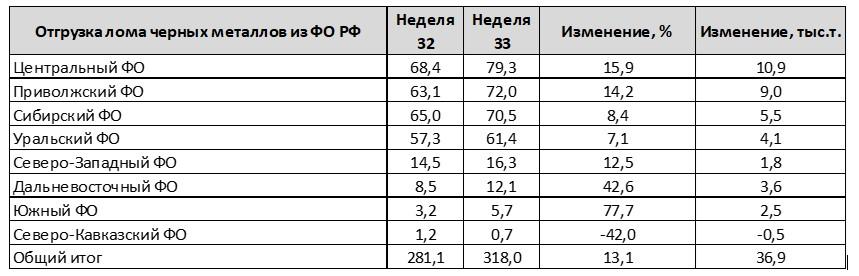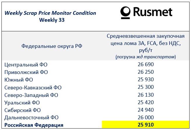 Ценовая ситуация. Согласно данных РА «РУСМЕТ», производящего расчет средневзвешенных закупочных цен на основе отгрузки металлолома жд транспортом и официальных ценовых предложений сталеплавильных предприятий, по итогам 33 недели средневзвешенная цена на территории РФ, в зависимости от ФО, показала разнонаправленную динамику. В целом по РФ произошло увеличение средневзвешенной цены на 60 руб/тонну до 25910 руб/тонну металлолома (3А, FCA, без НДС, руб/т)./Русмет, Серов А./