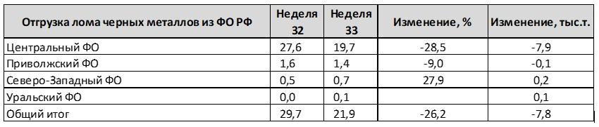 Согласно оперативным данным ГВЦ АО «РЖД» на 33 неделе отгрузка лома черных металлов по сети РЖД, в сравнении с предыдущей неделей, увеличилась на 9,4% до 339,9 тыс.т. Всего с начала августа во внутрироссийском и экспортном направлении жд транспортом было отгружено 942,9 тыс.т. металлолома.