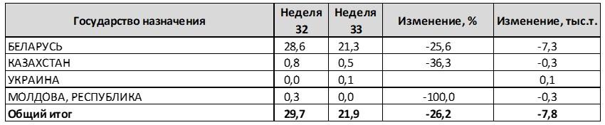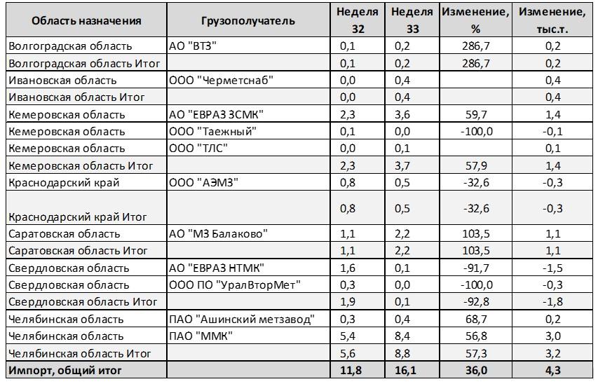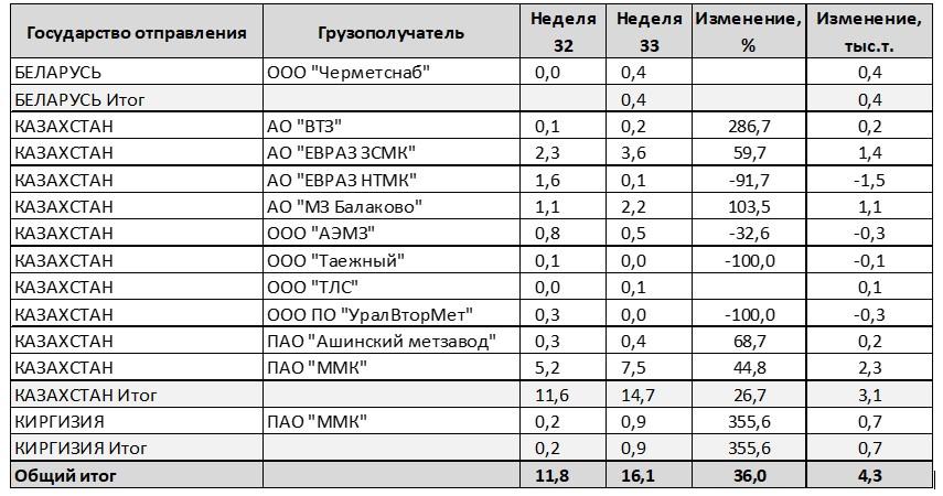 Экспорт лома черных металлов. На 33 неделе жд транспортом на экспорт было отправлено 21,9 тыс. т., что на минус 26,2% или минус 7,8 тыс. т. меньше предыдущей недели. Всего с начала месяца в экспортном направлении жд транспортом было отгружено 72,6 тыс. т. металлолома.