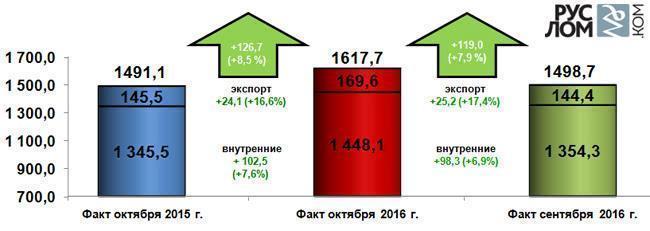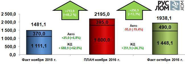 В ноябре 2016 г. поставка лом черных металлов в адрес металлургических предприятий РФ ожидается на уровне 2195,0 тыс. т., то на +256,9 тыс.т. или +13,3 % больше поставок металлолома в сентябре 2016 г. и на +713,9 тыс.т. или +48,2 % больше поставок в октябре 2015 г.