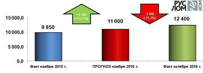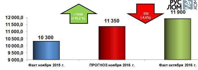 С учетом ожидания объемов закупки лома черных металлов игроками рынка, а также сезонных факторов, средневзвешенная цена закупки металлолома металлургическими предприятиями центрального региона РФ ожидается на уровне 11 000 руб./т, что на -1 400 руб./т или -11,3 % меньше уровня предыдущего месяца, и на +1 150 руб./т или +11,0 % больше чем в ноябре 2015 г.