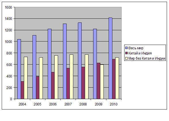 Несмотря на значительное расширение объемов производства многие страны «остального» (т.е. за пределами Китая и Индии) мира так и не восстановили докризисного объема выплавки. По данным WSA, в 2010 году государства «остального мира» выдали 720,1 млн. т стали, что на 6,8% меньше, чем в 2008 году. Более того, за пределами Китая и Индии в 2010 году было произведено меньше стали, чем в 2004-м! В частности, в ЕС-27 выпуск необработанной стали в 2010 году был на 12,9% меньше, чем за два года до этого, в Японии – на 7,7%, в США – на 11,9%, в России – на 2,2% и в Украине – на 9,6%.