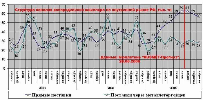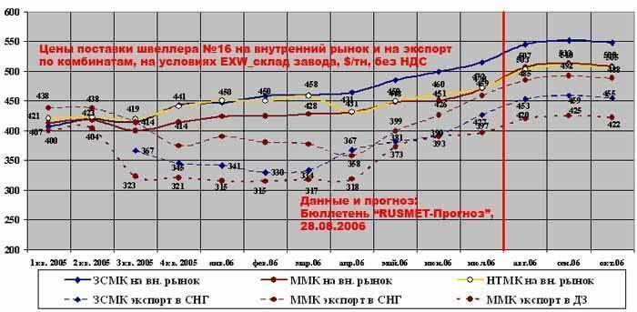 Спрос на швеллер, по нашим данным, в августе 2006 г. достиг пика порядка 90 тыс. т/мес., а сейчас начинается его плавное падение до уровня около 85 тыс. т/мес к концу октября.