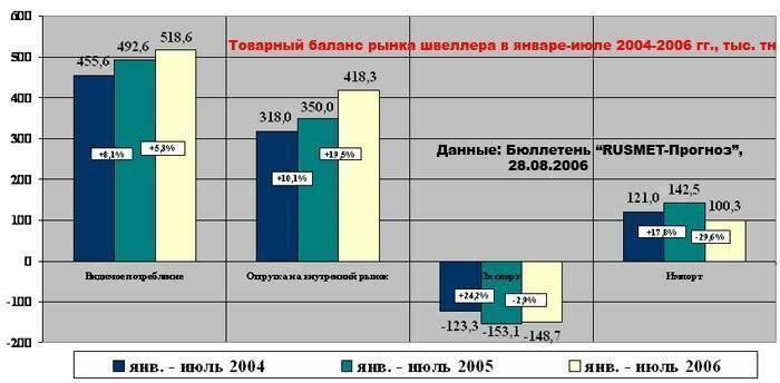 Экспорт швеллера по итогам 7 месяцев незначительно уступает показателям прошлого года. Видимое потребление и отгрузка на внутренний рынок - растут (+5,3%; +106 тыс. тн. и +19,5%; +68 тыс. тн, к 7 мес. 2005 г. соответственно), экспорт показывает незначительное снижение (-3%; -4,4тыс. тн.), импорт значительно снизился (-29,6%; -42 тыс. тн).