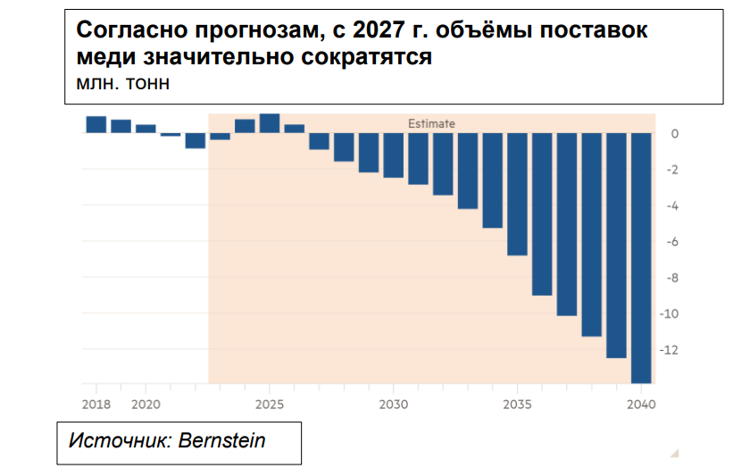 Глава европейского подразделения компании RBC Capital Markets, отмечает, что долгий процесс получения разрешений, инфляция и снижение концентрации меди в руде создают реальный риск нехватки меди для достижения целей декарбонизации в ближайшие десятилетия.