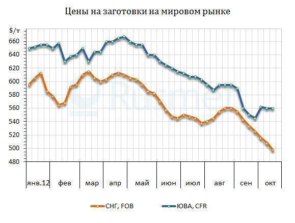 Поэтому, чтобы получить новые контракты, металлургам пришлось пойти на новые уступки. Белорусский метзавод в начале второй декады октября опустил свои котировки до $490-495 за т FOB. Таким образом, заготовки производства СНГ сократились до менее $500 за т впервые с июля 2010 года. Экспортеры из России и Украины котируют свою продукцию на уровне $505 за т FOB либо несколько ниже, но покупатели и от них требуют понижения до менее $500 за т FOB.
