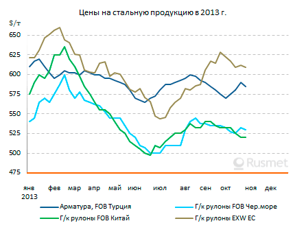 Примерно те же выводы делают и эксперты из других организаций. В частности, европейская металлургическая ассоциация Eurofer считает, что 3%-ное снижение спроса на стальную продукцию в ЕС в 2013 году сменится ростом на 2-2,5% в 2014-том. Специалисты MEPS вообще считают, что цены на прокат на мировом рынке, пройдя через крайнюю точку спада в 2013 году, теперь будут подниматься на протяжении, по меньшей мере, следующих трех лет.