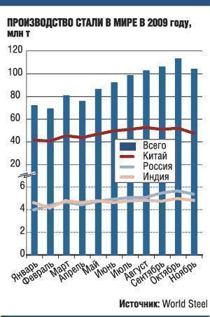 Производство стали в мире (по 66 странам, включая Китай) по итогам ноября 2009 года составило 107,5 млн т против 113,4 млн т месяцем ранее, подсчитали в международной организации World Steel Association (World Steel). Сокращение производства было отмечено по всем регионам мира, а также по ведущим странам-производителям, включая Китай, США, Индию, Россию и Бразилию. При этом помесячное снижение отмечается впервые за последние восемь месяцев. Эксперты отмечают, что Китай, который почти весь этот год был основным драйвером роста спроса на сталь, возможно, уже выпустил весь пар, но рассчитывают на стабилизацию рынка в следующем году благодаря восстановлению спроса в Европе и США.