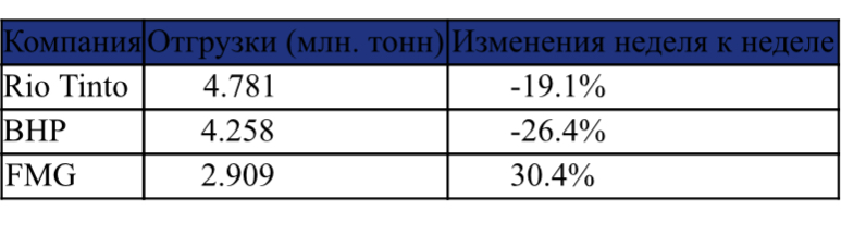 Среди трех ведущих австралийских железорудных компаний Rio Tinto и BHP сократили поставки железной руды в Китай: объем первой снизился на 1,1 млн тонн или 19,1% за неделю до 4,8 млн тонн после роста в течение двух предыдущих недель, в то время как тоннаж второй прекратил трехнедельный рост и упал на 1,5 млн тонн или 26,4% за неделю до 4,3 млн тонн.
