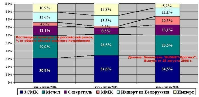 Как сообщается в Ежемесячном бюллетене «RUSMET-Прогноз» от 28.08.2006, продолжается плавное сокращение доли 2 основных игроков на рынке арматуры, Мечела и ЗСМК, по итогам 7 месяцев 2004-2006 гг. Северсталь, а особенно - ММК, наоборот, продолжают наращивать свою долю в объеме видимого потребления на внутреннем рынке с 8,5% до 13,1% (Северсталь) и с 2,2% до 10,5% (ММК) за 7 месяцев 2005 и 2006 гг. соответственно.