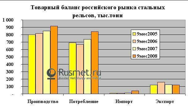 По итогам девяти месяцев 2008 года суммарное потребление рельсового проката на российском рынке составило свыше 0,84 млн.тонн, что превышает показатели аналогичного периода прошлого года на 14%. При этом темпы роста объемов производства по итогам первых трех кварталов составили всего 8%, т.е. фактически спрос опережал рост предложения.