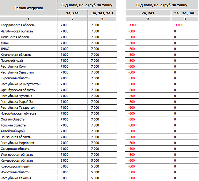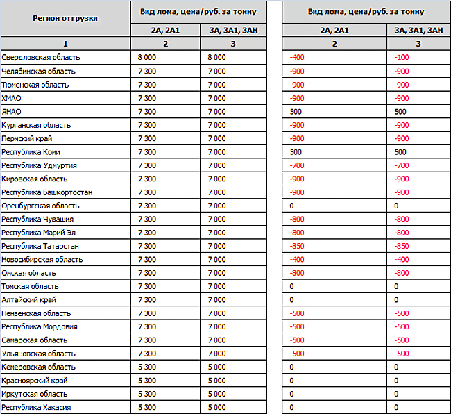 ОАО «ММК» с 09 по 14 декабря заявило о снижении цен практически по всем направлениям. На 16 число текущего месяца больше всего металлолома поступило на комбинат из Челябинской (23,1 тыс. т) и Тюменской (12,3 тыс. т) областей. Средневзвешенная цена с учетом отгрузки из всех регионов составляет 7500 руб./т (без НДС и ж/д доставки).