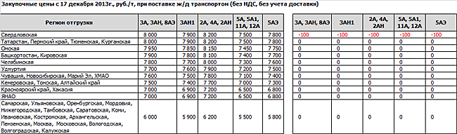 ОАО «СТЗ» с 17 декабря снизило на 100 руб/т цены для поставщиков из Свердловской обл., таким образом сравняв цены для всех регионов на уровне 7000 руб/т. По состоянию на 16 декабря средневзвешенная цена, с учетом отгрузки из всех регионов. Составляла 7750 руб/т (без НДС и доставки), опережение линейного плана - 9,3 тыс. т. Максимальная отгрузка производилась из Свердловской (17,48 тыс. т) и Тюменской (14,89 тыс. т) областей.