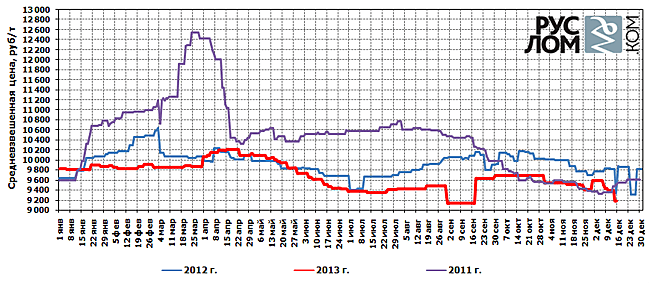 Таким образом, по состоянию на 16 декабря 2013 г. средневзвешенная цена на лом черных металлов, закупаемый металлургическими предприятиями Центрального региона (с учетом среднего ж/д тарифа) находится на уровне 9200 руб./т, материала в Уральском регионе – 9400 руб./т.