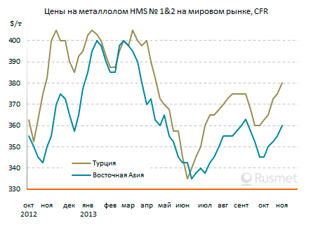 /Rusmet.ru, Виктор Тарнавский/ Металлолом, начавший дорожать на мировом рынке в конце сентября, на протяжении всего прошедшего месяца уверенно шел вверх. За это время котировки как в Турции, так и в странах Восточной Азии поднялись на $15-20 за т. Причем, данный скачок произошел на фоне относительно низкого спроса на сырье и стагнирующего рынка длинномерного проката. Тем не менее, повышение не производит впечатление совсем уж неоправданного.