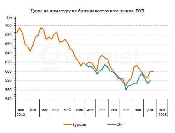 /Rusmet.ru, Виктор Тарнавский/ Спад на ближневосточном рынке длинномерного проката, наблюдавшийся в первой половине декабря, в последнюю неделю сменился осторожным повышением. Подорожание металлолома заставило турецких металлургов заняться пересмотром котировок как на внутреннем рынке, так и за рубежом. Стоимость арматуры, в начале второй декады декабря сократившаяся до $580-590 за т FOB, поднялась до $595-605 за т FOB, а некоторые компании выставляют предложения на уровне $600-615 за т FOB. На внутреннем рынке арматура подорожала от менее $600 до $595-610 за т EXW (без НДС).