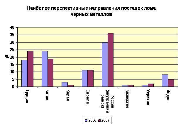 Основными потребителями российского лома являются Китай и Турция, однако, по мнению участников опроса, на фоне снижения поставок российского лома в азиатский регион, в 2007 году Турция займет лидирующие позиции, как потребитель российского лома.