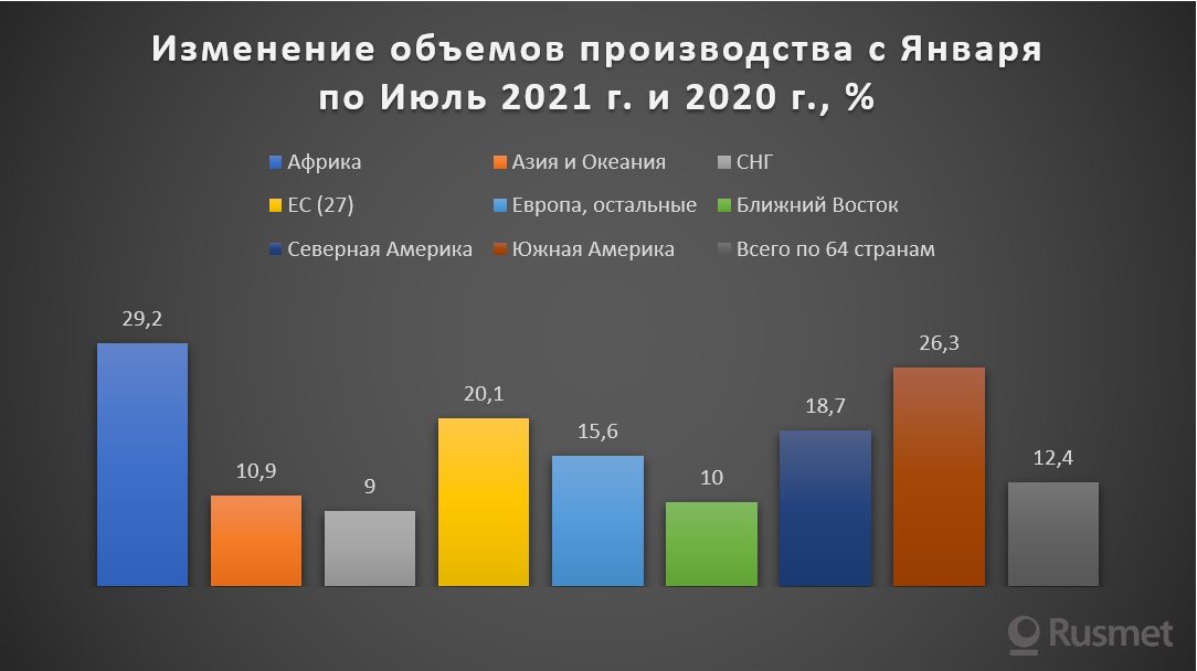 Африка произвела 1.3 Мт стали в июле 2021 года, что выше показателей июля 2020 года на 36.9%. Азия и Океания произвели 116.4 Мт, падение на 2.5%. Страны СНГ произвели 9.2 Мт, что больше на 11.2%, чем в июле 2020 г. ЕС (27) произвел 13.0 Мт, рост составил 30.3%. Остальные страны Европы произвели 4.1 Мт, что выше значений июля 2020 г. на 4.6%. На Ближнем Востоке было произведено 3.6 Мт – выше на 9.2%. Северная Америка произвела 10.2 Мт стали, выше на 36.0%. Южная Америка, в свою очередь, произвела 3.8 Мт, что выше показателей 2020 года на 19.6%.