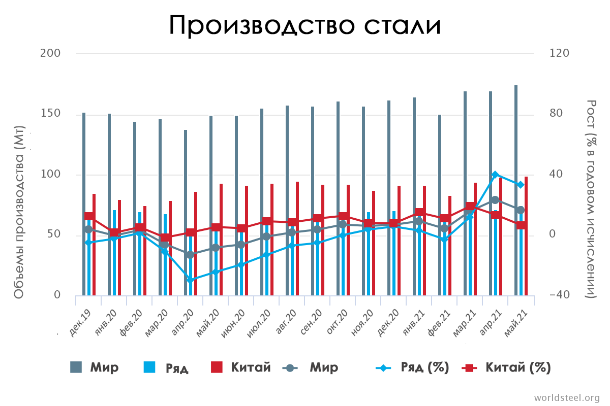 Согласно данным, предоставленным в ассоциацию Worldsteel от 64 стран, мировое производство стали в Мае 2021 года составило 174.4 Мт, что на 16.5% больше, чем в Мае 2020 года.