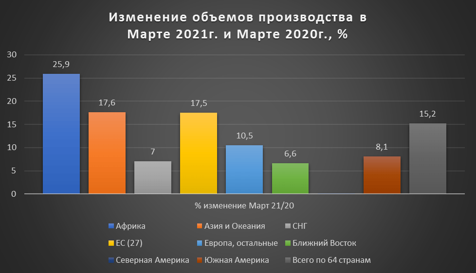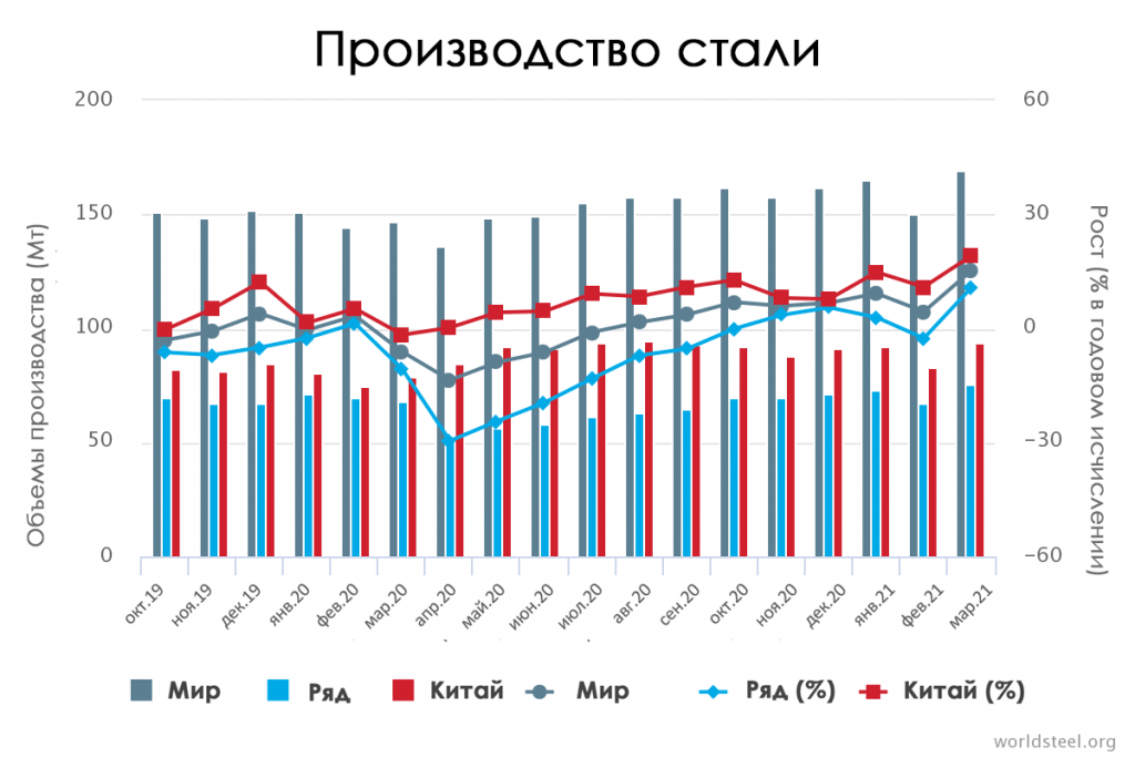 Согласно данным, предоставленным в ассоциацию Worldsteel от 64 стран, мировое производство стали в Марте 2021 года составило 169.2 Мт, что на 15.2% больше, чем в Марте 2020 г.