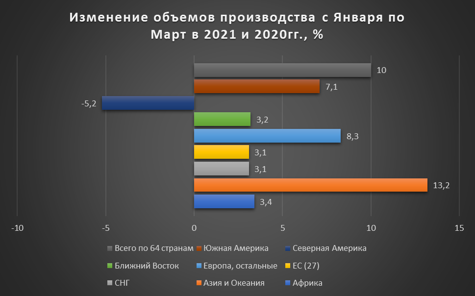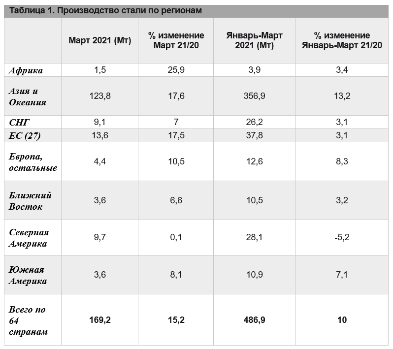 Мировое производство стали за первые три месяца 2021 года составило 486.9 Мт, что на 10,0% выше по сравнению с тем же периодом 2020 года.