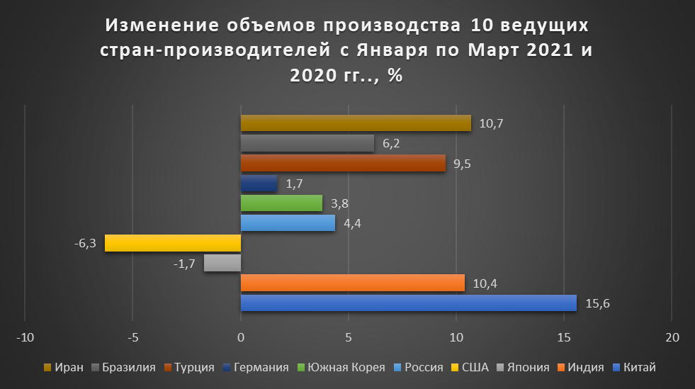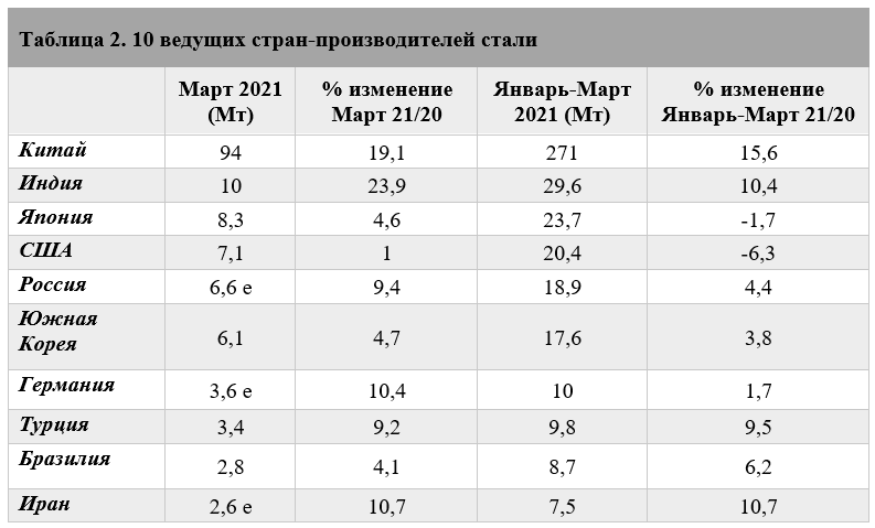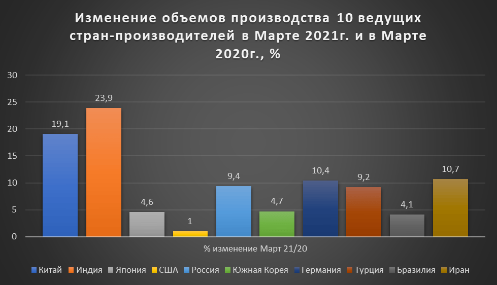 Китай произвел 94.0 Мт в Марте 2021 г., что на 19.1% выше, чем в Марте 2020 г. Индия произвела 10,0 Мт, что выше 23,9%. Япония, в свою очередь, произвела 8,3 Мт, рост на 4,6%. Объем производства стали в Соединенных Штатах составил 7,1 Мт, что выше по сравнению с прошлым годом на 1,0%. По оценкам, Россия произвела 6,6 Мт – что на 9,4% больше. Южная Корея произвела 6,1 Мт стали – это выше на 4,7%. Производство стали в Германии возросло на 10,4% и составило 3,6 Мт. Турция произвела 3,4 Мт – рост на 9,2%. Бразилия произвела 2,8 Мт, что на 4,1% больше по сравнению с аналогичным периодом прошлого года. Иран произвел 2,6 Мт стали, что на 10,7% выше, чем в 2020 году.