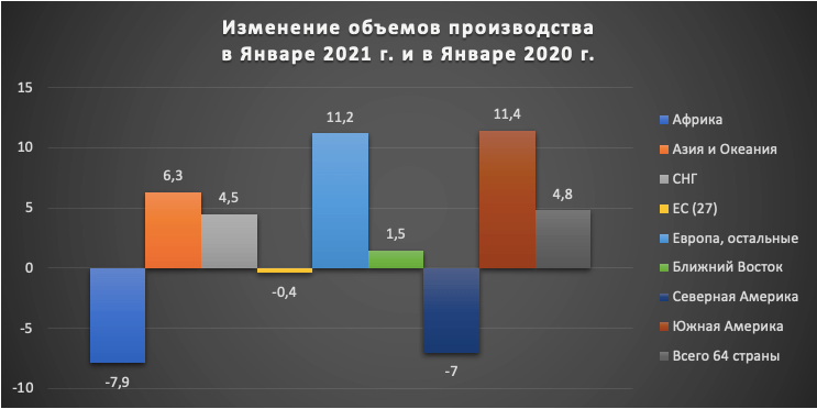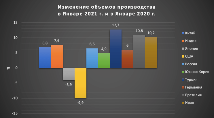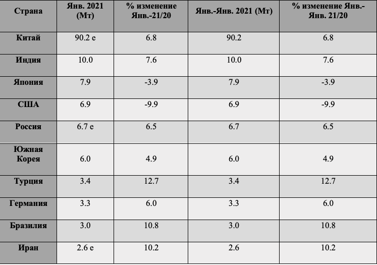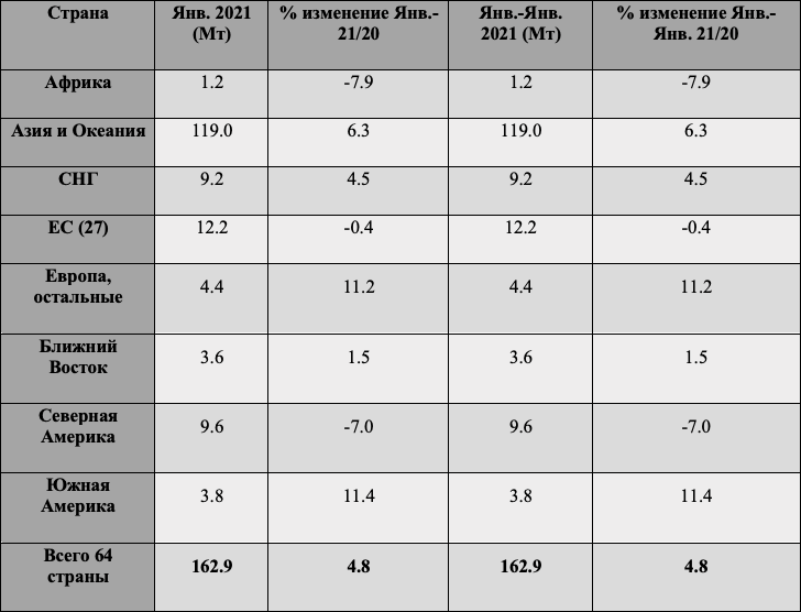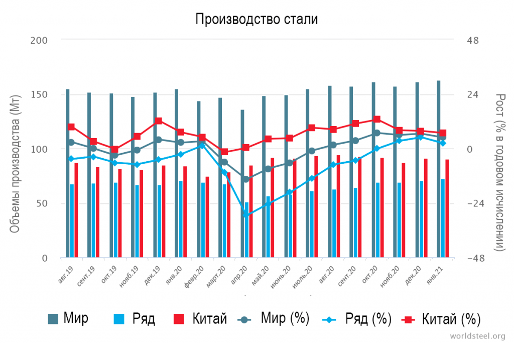 Согласно предоставленным данным от 64 стран во Всемирную Ассоциацию Стали (worldsteel) мировое производство стали в Январе 2021 года составило 162.9 миллионов тонн (Мт), что на 4.8% больше, чем в Январе 2020 г.