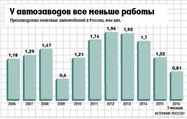Об этом заявил во вторник, 15 ноября, замминистра промышленности и торговли Василий Осьмаков. Впрочем, как передал его слова ТАСС, рост производства он обусловил продолжением господдержки автопрома.Выпуск легковых автомобилей в России падает с 2013 г. (см. график). За январь – сентябрь 2016 г. он снизился на 11,8%. По итогам января – октября 2016 г. российский рынок легковых автомобилей и LCV сократился на 13,3% до 1,15 млн шт. При суммарной мощности более 3 млн автомобилей в год заводы загружены в среднем меньше чем на 40%. Правительство стимулирует спрос с помощью нескольких программ, включая программу обновления автопарка, льготных автолизинга и автокредитования, госзакупки техники и проч. Всего на господдержку в этом году выделено почти 60 млрд руб.