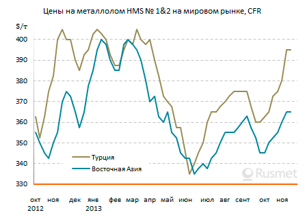 /Rusmet.ru, Виктор Тарнавский/ Вторая половина октября ознаменовалась на мировом рынке металлолома резким повышением цен при поставках в Турцию. Ряд местных металлургических компаний слишком долго тянули с пополнением запасов, тем более, что перед началом зимнего сезона производители стали увеличивали объемы закупок. При ограниченном объеме предложения покупателям, нуждавшимся в срочных закупках, пришлось пойти на условия поставщиков, что и вызвало подъем цен, в среднем, на $15 за т в течение недели.