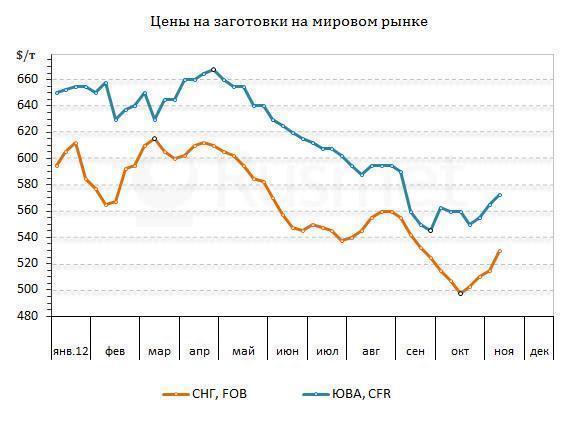 /Rusmet.ru, Виктор Тарнавский/ Цены на заготовки производства СНГ, начавшие подниматься во второй половине октября, в ноябре значительно ускорили свой рост. Экспортеры, выйдя на рынок с декабрьской продукцией на уровне $510-515 за т FOB, быстро получили возможность для повышения котировок благодаря подорожанию металлолома на Ближнем Востоке, с одной стороны, и некоторой активизации прокатчиков, приступивших к пополнению запасов, с другой.