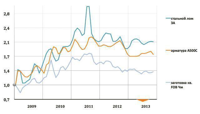 Индекс цен на стальные лом, заготовку и арматуру в 2009-2013 г.г.
