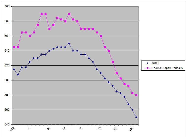 Металлургические компании из других стран пока не в состоянии опускать цены так низко. Экспортные котировки на корейский и японский горячий прокат находятся в пределах $590 за т FOB, хотя тайванские компании предлагают аналогичную продукцию по $570-575 за т FOB. Положение японцев выглядит наиболее сложным, так как из-за высокого курса иены они не могут слишком сильно сбавлять долларовые котировки. В июне японский экспорт горячего проката сократился более чем на 10% по сравнению с предыдущим месяцем.