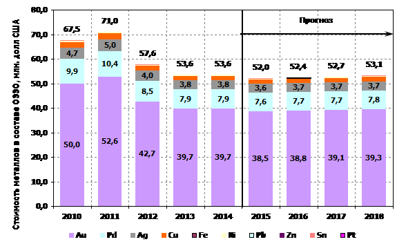 Стоимость металлов, безвозвратно утраченных из-за неполного сбора отходов электронного и электротехнического оборудования, только по 2014 г оценивается в 333 млн. долл. Если ситуация со сбором не изменится, экономические потери достигнут 400 млн. долл США к 2018 г.В количественном выражении содержание металлов в электронном и электротехническом оборудовании оценивается: