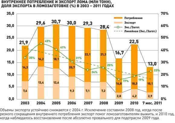 Особенно снижение объемов отразилось на экспорте российского лома, поставки которого снизились с 13,4 млн тонн в 2004 году до 2,9 млн тонн по итогам 7 месяцев 2011 года. По данным аналитической группы METALRESEARCH за 2010 год, среди основных регионов-экспортеров выделялся Санкт-Петербург с долей в общих объемах экспорта 36%, Ростовская область (14%) и Приморский край (11%). Все вместе данные регионы занимали в 2010 году более 60% экспорта.