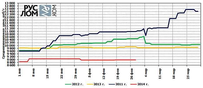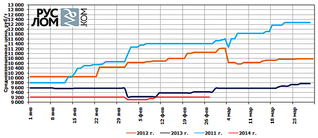 По итогам февраля 2014 г. средневзвешенная цена закупа лома черных металлов его крупнейшими потребителями Европейской части РФ, с учетом среднего жд тарифа, составила 8975 руб./т.
