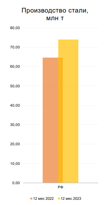 Аналитики РА «Русмет» сообщают, что объем производства стали на метпредприятиях России за 12 месяцев 2023 года вырос на 6%, до 73,9 млн тонн по сравнению с аналогичным периодом прошлого года.