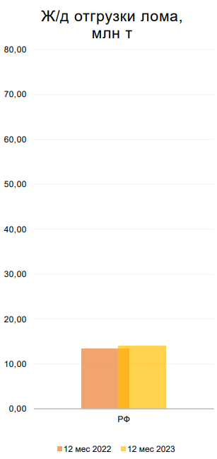 За отчетный период ж/д отгрузки лома на метпредприятия РФ выросли на 5%, до 14,1 млн тонн по сравнению с аналогичным периодом 2022 года.