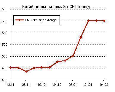 В частности, в начале февраля на востоке КНР большая часть заводов предлагает за металлолом марки HMS №1 порядка 3650-3700 RMB/т с доставкой и 17% НДС, что при текущем валютном соотношении $1 = RMB6,58 эквивалентно 553-561 $/т с доставкой и 17% НДС, и соответствует котировкам недельной давности. Устойчивости региональных котировок в определенной степени способствует пассивность Shagang, основного потребителя, который с 20 января повысил закупочные цены на 150 RMB/т, до 3680 RMB/т (558 $/т) с доставкой и 17% НДС и удерживает их.